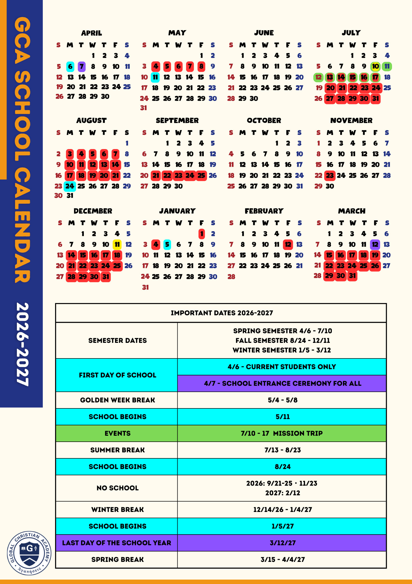 2026 - 27 GCA Calendar